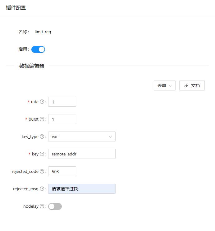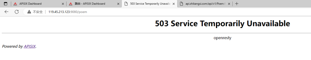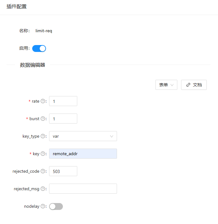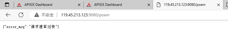 配置频率限制,这里是2次/s就会被拒绝,返回默认页面,计数依据为IP地址,文档:https://apisix.apache.org/zh/docs/apisix/plugins/limit-req/![]()
