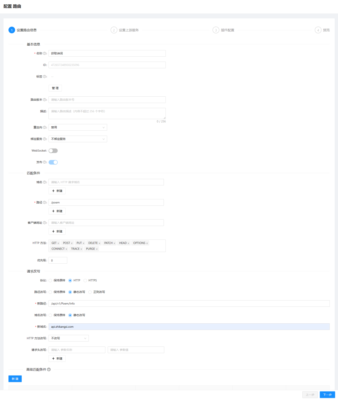 这里简单配置了一下,域名其实就是获取来源hostname,路径就是正常的请求路径,后面的路径改写是改写APISIX请求后端服务器的路径,我这里后端服务器会验证hostname,所以还要改写域名。![]()