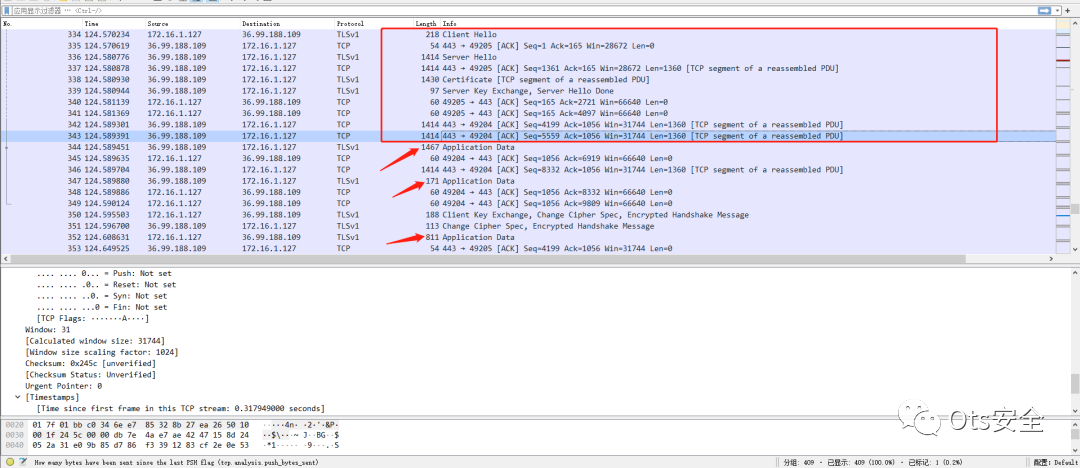 上面几个流量数据包走完,我发现Data这个数据包对TCP段的重新组装信息