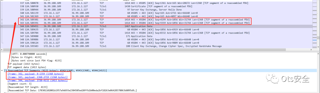 这个日志中的信息表明已经成功地重新组装了三个TCP段,得到了一个完整的数据块,总共长度为4133字节。每个TCP段都被分配了一个帧号和相应的有效负载范围。以342、343组成的一个数据块。