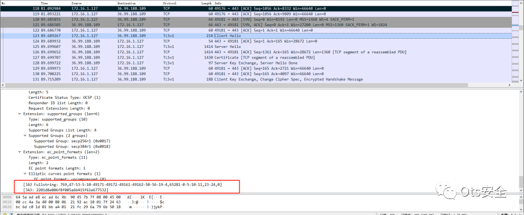 后续补充在这部分是有发现JA3指纹,怎么说JAS是一种用于TLS客户端指纹识别的技术,可以识别不同TLS客户端的行为和参数,用于识别恶意或异常的网络通信。JA3指纹是根据TLS客户端在握手过程中选择的加密套件、加密算法、压缩方法、SSL版本等参数生成的哈希值。emm...可以移步看看这篇文章:http://www.taodudu.cc/news/show-3395360.html?action=onClick【利用JA3和JA3S识别加密数据流量】