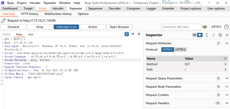 打开浏览器,输入需要访问的URL并按回车键,这时将看到数据流量经过Burp Proxy并暂停,直到单击“Forward”按钮,才会继续传输。单击“Drop”按钮后,这次通过的数据将丢失,不再继续处理。