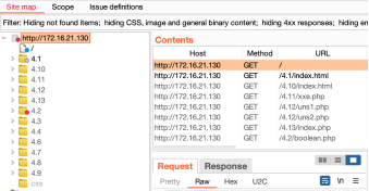 Spider的蜘蛛爬取功能可以帮助我们了解系统的结构。其中Spider爬取到的内容将在Target中展示,如图3-24所示,界面左侧为一个主机和目录树,选择具体某一个分支即可查看对应的请求与响应。