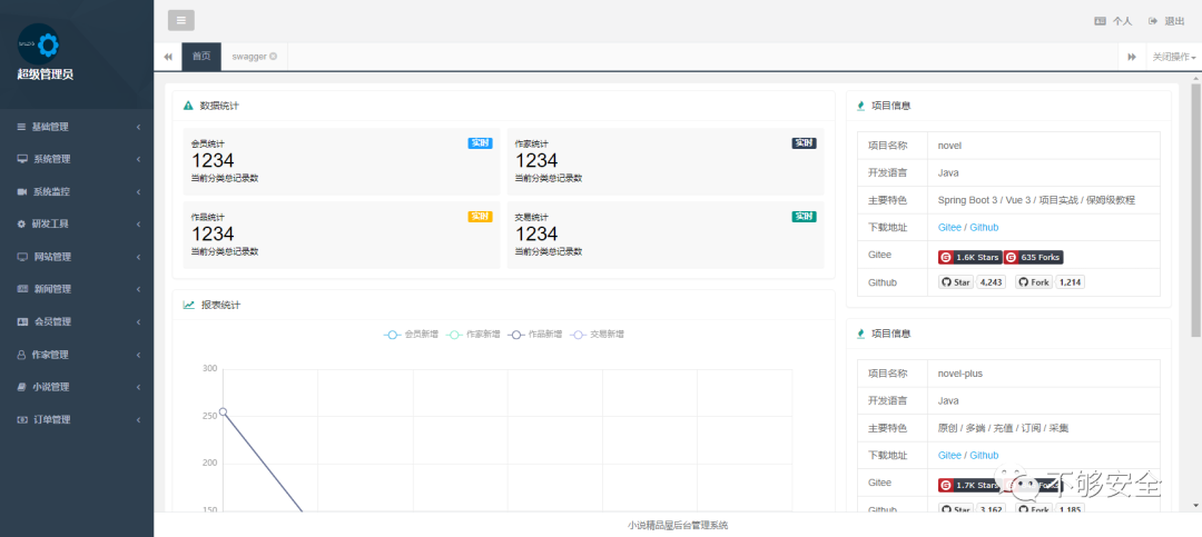 novel-plus 是一个多端(PC、WAP)阅读,功能完善的原创文学 CMS 系统。由前台门户系统、作家后台管理系统、平台后台管理系统和爬虫管理系统等多个子系统构成,包括小说推荐、作品检索、小说排行、小说阅读、小说评论、会员中心、作家专区等功能,支持自定义多模版、可拓展的多种小说内容存储方式(内置数据库分表存储和 TXT 文本存储)、阅读主题切换、多爬虫源自动采集和更新数据、会员充值、订阅模式、新闻发布和实时统计报表。