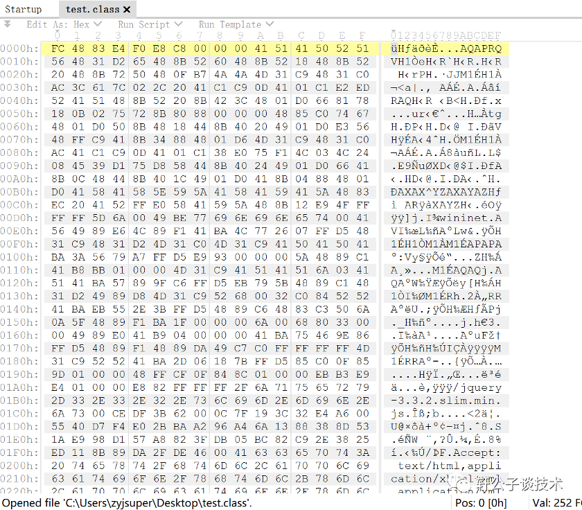 用16进制打开看一下,\xFC\x48\x83\xE4,学过免杀的小伙伴应该已经猜到了,这是msf的码子
