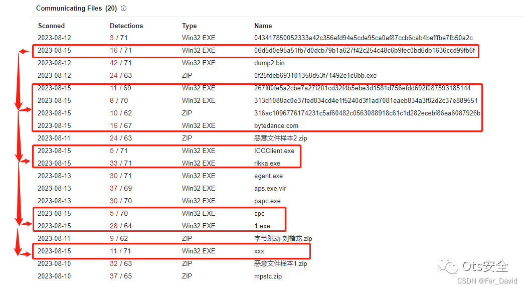 样本名称:关于统一2023年度各项社会保险缴费工资基数上下限的通告.exeSHA-256:24f23ae6ca9a0f9f36faa116687062fb39a2fda328c1b41dc7049ead12e4dc20最后一次披露时间:2023-08-12 09:25:26样本名称:单位职称人员情况统计表.exeSHA-256:7cee9a39a2f28db35f55257b24c3aebbff8597bfd7fa72057d54d4316a5464b9最后一次披露时间:2023-08-14 11:53:43样本名称:安全插件.exeSHA-256:99fbce03fe5d20be405d6d42a289df53939fa9331e44794044de1af414486350最后一次披露时间:2023-08-15 02:49:45样本名称:**衡出轨事实.zipSHA-256:e522fa4bbd3368bcfa27068a39e91e4d54128f784a47d9536a9cfdb6d4771e82最后一次披露时间:2023-08-14 02:59:56样本名称:关于官网注册后信息有关问题的反馈.exeSHA-256:7f7990d7caebf089b056555f2e6c6519d58c38e0aa8276322c11175bfa3c987e最后一次披露时间:2023-08-16 05:41:45