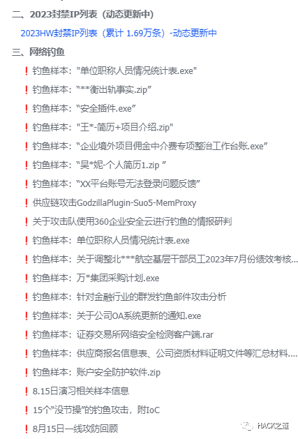 2023HW漏洞POC/EXP、情报汇总知识库主要分为漏洞POC、红队可疑IP地址列表、网络钓鱼样本、厂商发布的安全通告、厂商设备默认账号密码、应急响应技术、技站法、HW总结模板等8大方面,并将会根据