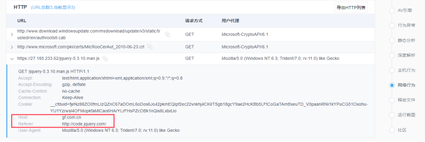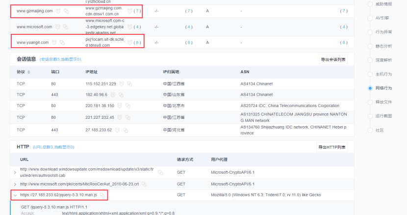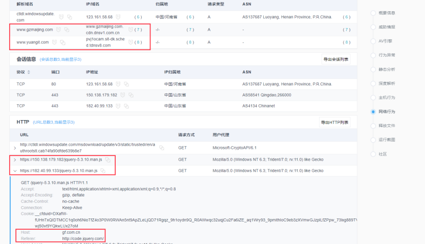 对于压缩包中的文件,可以提取出来单独投递云沙箱,以获得更详细的行为。压缩包的中的wda.tmp和mbp.tmp实际为白利用组件,根据aaa.bat脚本代码将其重命名为Mcods.exe和McVsoCfg.dll,打包后一起投递到云沙箱中(上面列表中的样本”11.zip”,红雨滴云沙箱报告链接见上面列表)。在云沙箱报告的网络行为中可以看到,样本使用域前置方式隐藏真实C2地址,连接经过同一套CDN服务器加速的域名www.yuangit[.]com和www.gzmaijing[.]com,HTTP请求的Host字段设为gf.com.cn进行CDN流量转发。