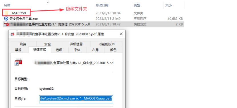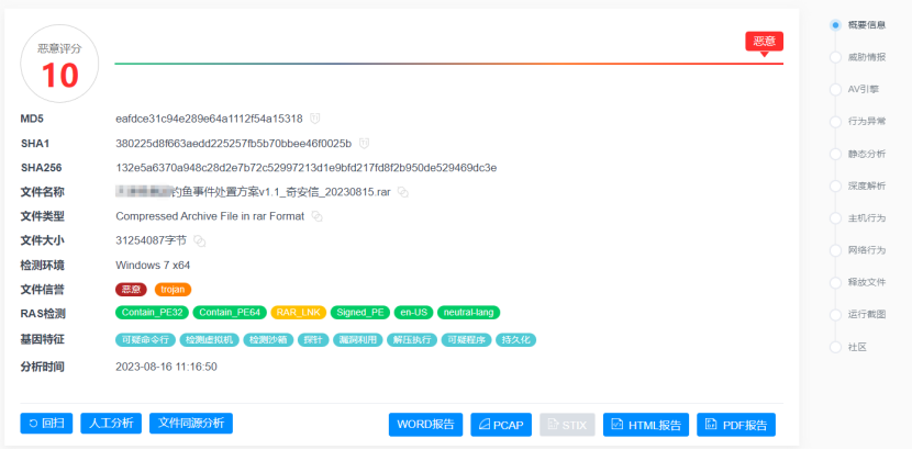 样本文件名 | ***集团钓鱼事件处置方案v1.1_奇安信_20230815.rar |