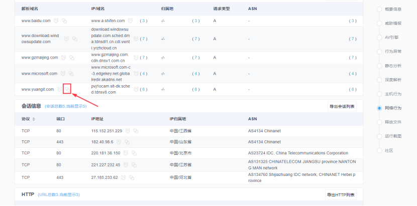 通过点击解析域名信息右侧的对角圆圈图标(关联查询)可以直接得到访问相同域名的样本列表。