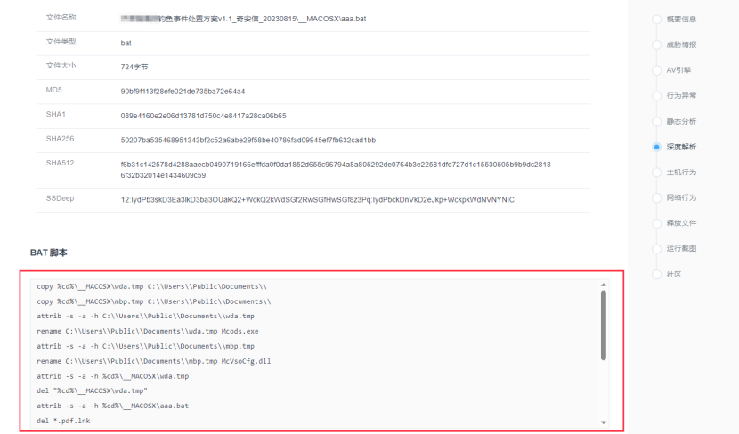 经过沙箱辅助分析,解读分析报告后,我们对该样本的整体行为有了初步了解:该样本伪装成安全事件处置报告,而RAR压缩包中的LNK文件带有PDF文档图标,受害者点击LNK文件后启动隐藏文件夹中的bat脚本,该脚本进一步打开诱饵文档迷惑受害者,并运行木马程序与攻击者建立网络通信。