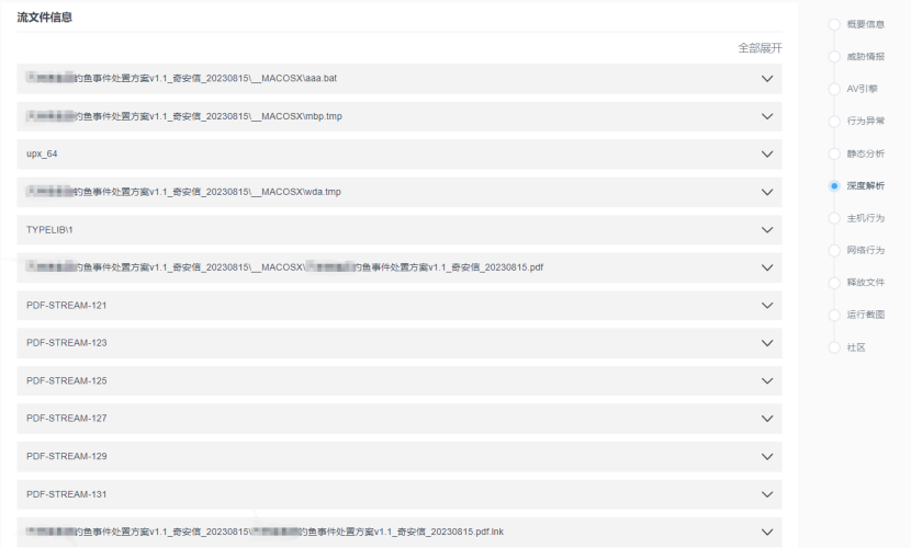 点击右侧导航栏的深度解析功能,在流文件信息部分展示了压缩包中包含的文件,这些文件的详细信息默认全部展开,可以点击右上角的“全部收起”显示概要信息。