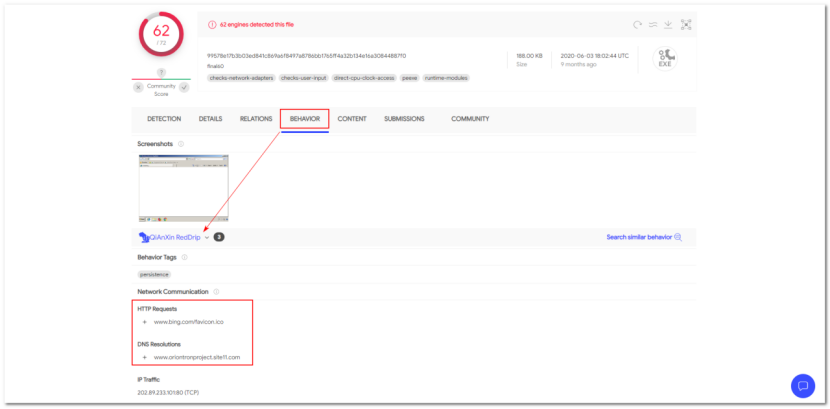 VirusTotal样本动态分析结果中集成的红雨滴云沙箱分析结果