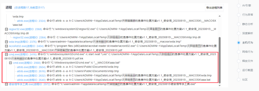 主机行为功能的进程显示,LNK文件运行后启动aaa.bat脚本,修改多个文件的文件属性。