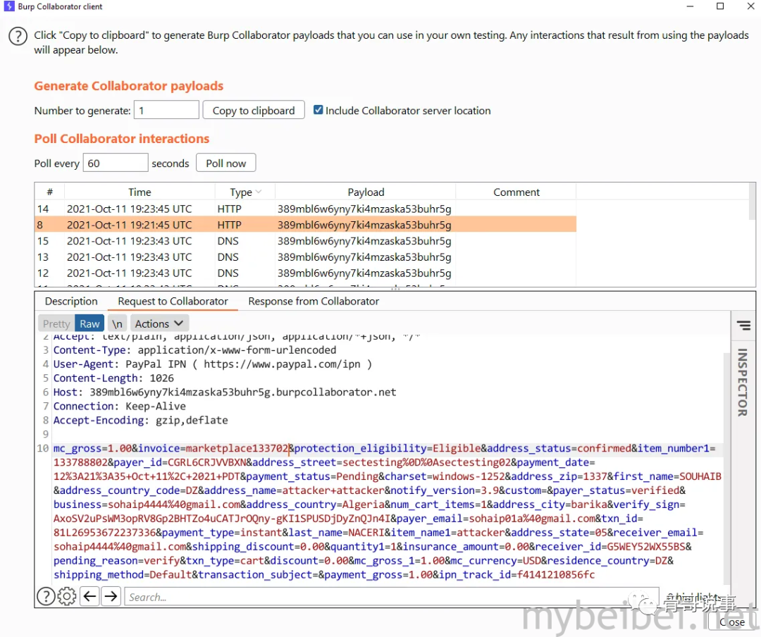 在 Burp Collaborator 中,当受害者点击时,也可以看到受害者帐户的完整信息: