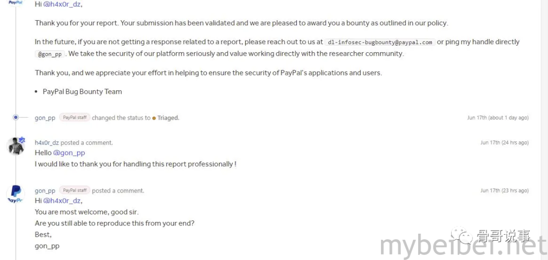 直到2022年6月17日,PayPal Bug Bounty 团队最终决定接受该报告并解决了此漏洞,同时发放 3200 美元的赏金奖励: