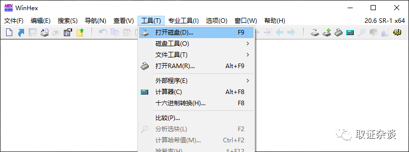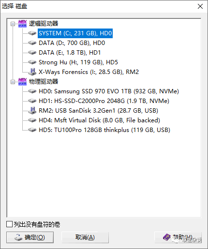 步骤2:点击WinHex菜单栏“工具”→“打开磁盘”,然后选择逻辑驱动器中的C盘[ 如果多个同学使用同一台电脑做实验,第一个同学选择C盘,第二个同学则可选择D盘,以此类推。],并点击“确认”按钮。如下图所示。
