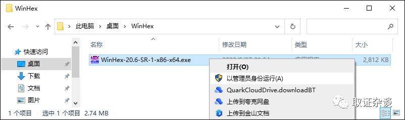 步骤1:右击“WinHex”图标,选择“以管理员身份运行”。如下图所示。