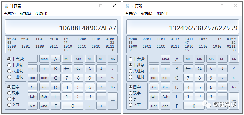 步骤4:将数据转换为十六进制数字。由于此处的filetime时间戳是小端字节序(Little-endian)存储,“A7 1E C7 89 E4 B8 D6 01”表示的实际数字为“01D6B8E489C7AEA7”。步骤5:将十六进制数字转换为十进制数字。打开Windows内置的计算器工具,点击菜单栏“查看”,选择“程序员”。在十六进制模式下输入“1D6B8E489C7AEA7””,然后点击“十进制”转换为十进制数字,即为“132496530757627559”。如图 5所示。