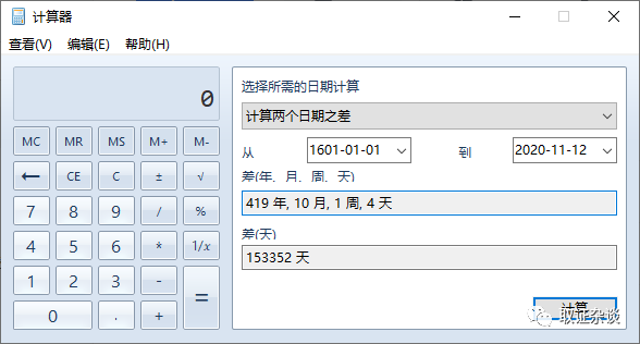 根据filetime时间戳的定义,“时间起点”为1601-01-01 00:00:00,记录的时间精度为100纳秒(即10-7秒),所以数字“132496530757627559”意味着时间戳“A7 1E C7 89 E4 B8 D6 01”所表示的是从1601-01-01 00:00:00经过132496530757627559个100纳秒后的时间,即从1601-01-01 00:00:00经过13249653075秒的时间。步骤6:日期时间计算。一天等于86400秒(60×60×24=86400)。13249653075/86400 = 153352.466145833;13249653075%86400 = 40275。所以步骤5中计算的时间为1601年1月1日后又经过了153352天加40275秒。步骤7:日期计算。打开Windows内置的计算器工具,点击菜单栏“查看”,勾选“日期计算”。计算得知1601年1月日至2020年11月12日经过了153352天。如图 6所示。