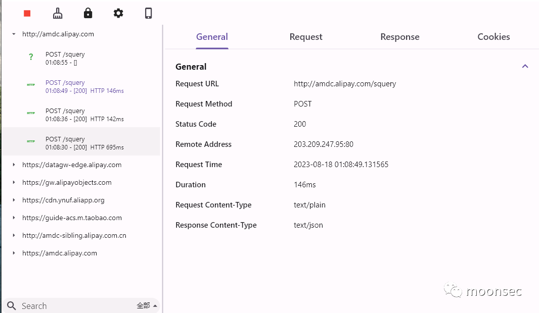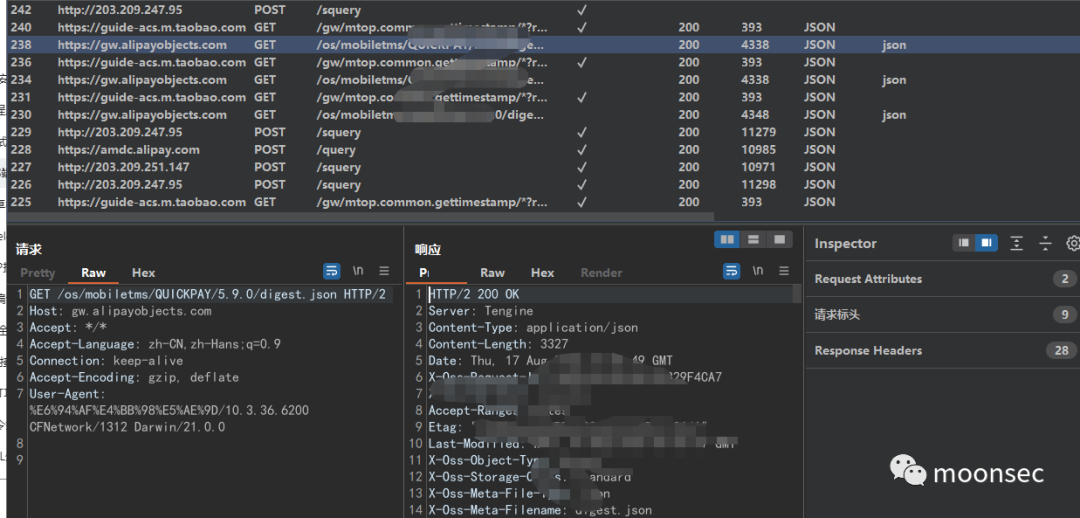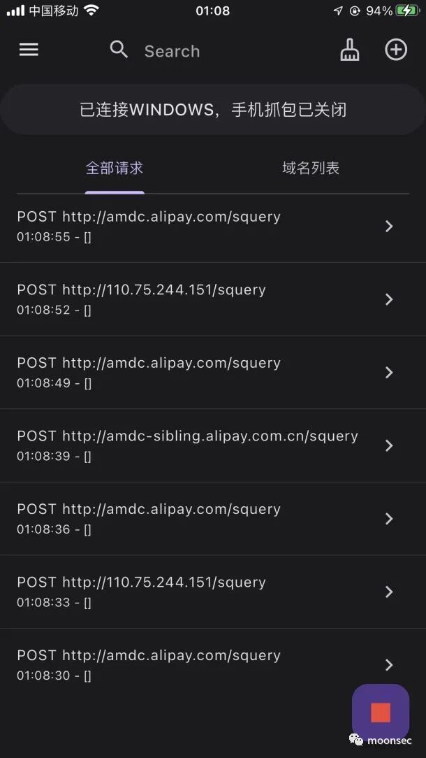 四、开启抓包测试这里我尝试手机访问某付宝可以清楚的发现流量已经抓发到burp了![]()