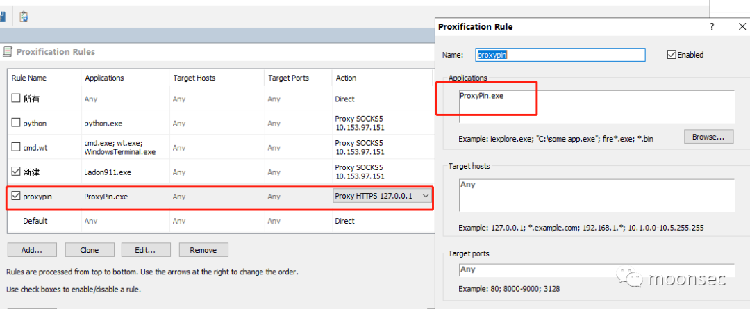 然后我们再使用proxifier代理流量到burp配置proxifier代理规则![]()