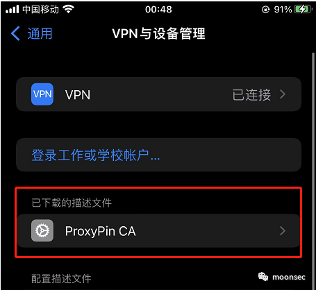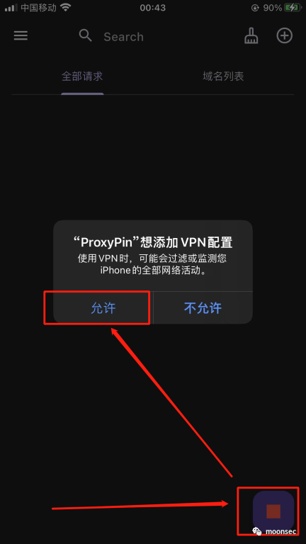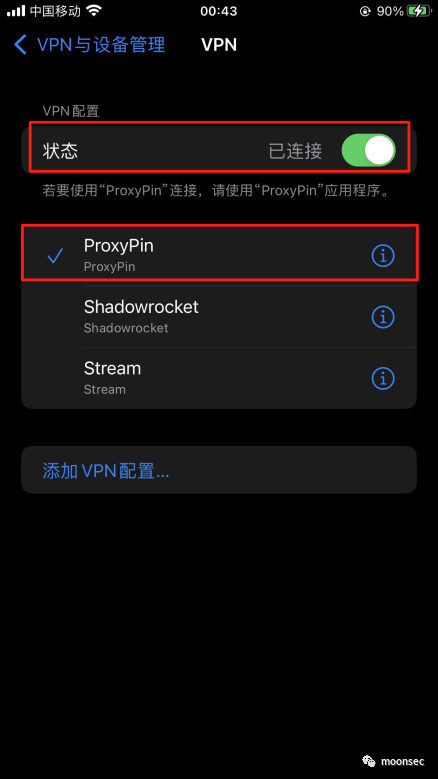 2、允许后我们需要看到vpn已经开启,并且选择的是proxypin![]()