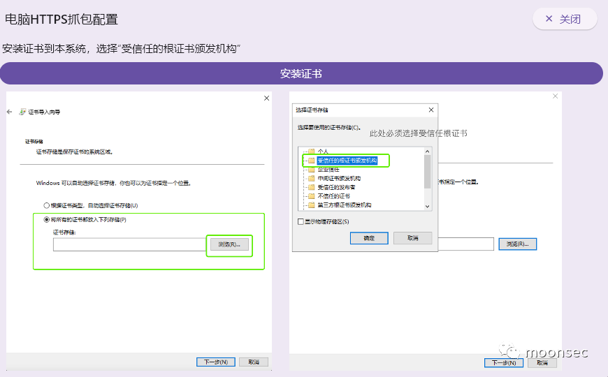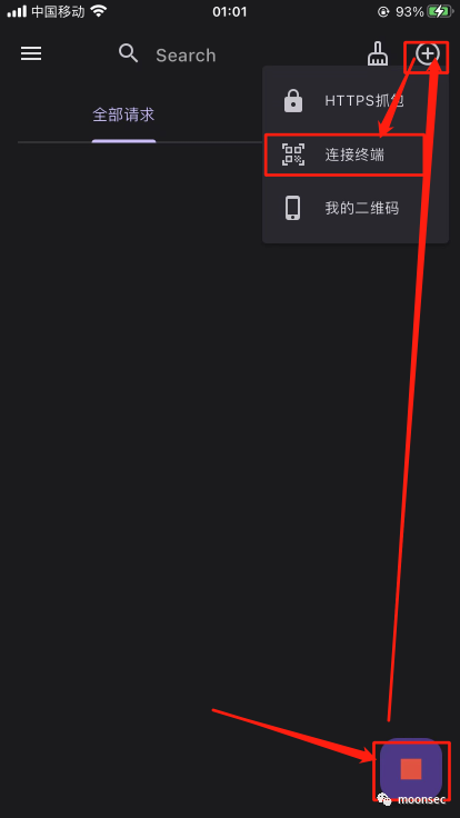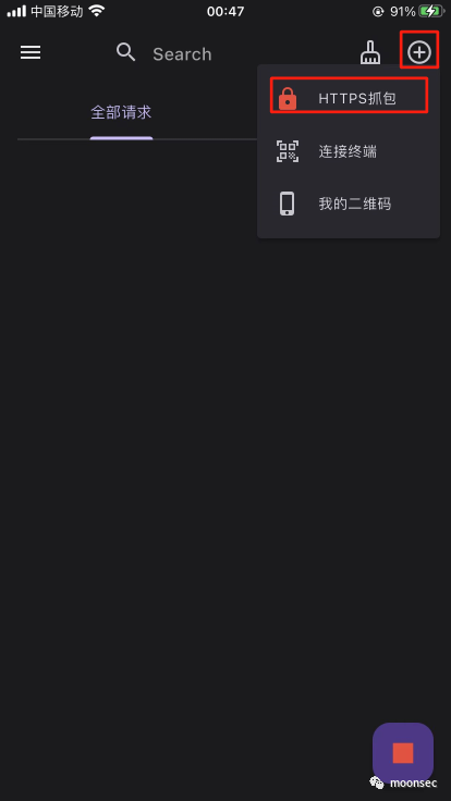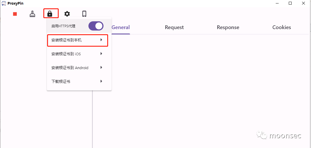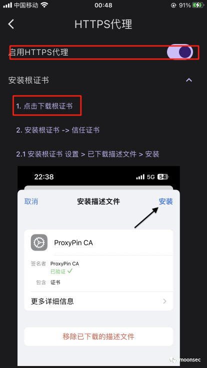 3、回到proxypin选择右上角+号,再选择HTTPS抓包,启用HTTPS代理,然后按步骤点击下边的下载根证书,安装根证书和信任根证书![]()
