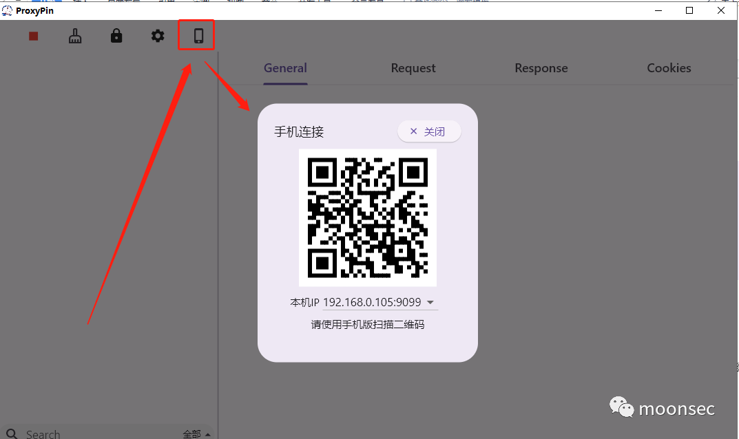 三、配置流量转发我们手机和电脑连接同一wifi,然后ios的proxypin开启代理,使用上边的连接终端功能扫描windows端的proxypin进行共享流量到windows端![]()