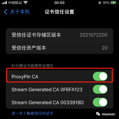 然后在设置-》通用-》关于手机-》证书信任设置进行开启![]()