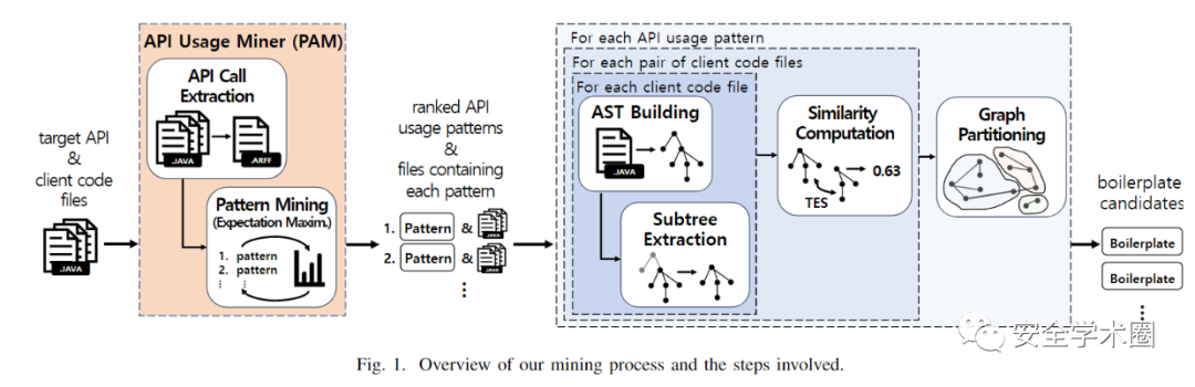作者使用了开源的API序列挖掘工具PAM[2]对选定的13种常用API的使用模式,具体而言PAM首先对每个源代码文件进行解析,并从每个方法种提取目标API的调用序列,然后使用深度优先遍历抽象语法树的方法进行解析,同时记录每个API调用在不同方法中的频率信息,以通过期望最大算法来构建概率模型(对应样板代码的High frequency这一特点),以识别常见的API调用序列。