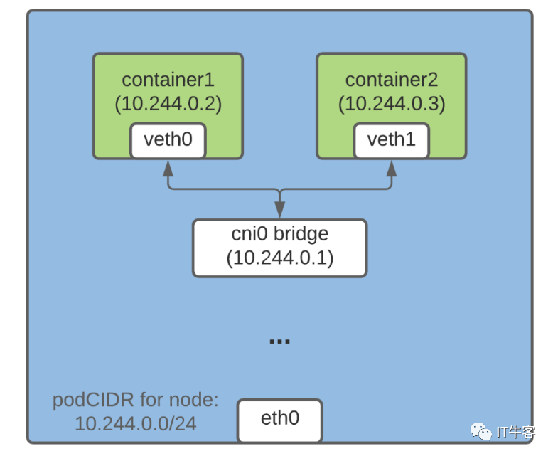 在同一主机上运行的容器通过 IP 地址相互通信的方法之一是使用 Linux Bridge,即在 Kubernetes(和 Docker)世界中,创建 veth(虚拟以太网)设备。该 veth 设备的一端连接在容器网络命名空间,另一端连接到主机网络上的 Linux Bridge。同一主机上的所有容器都将这 veth pair 的一端连接到 Linux Bridge,它们可以通过 Bridge 使用 IP 地址相互通信。Linux Bridge 也被分配了一个 IP 地址,它充当从目的地到不同节点的 Pod 流出流量的网关。![]()