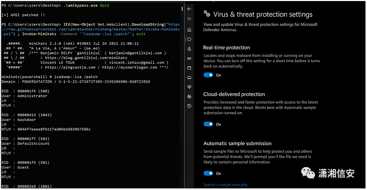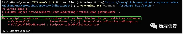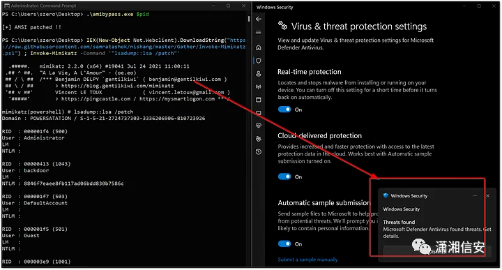 如果我们不结束(退出)正在加载 mimikatz 的 PowerShell 进程,那么它将被标记,尽管它会显示 NTLM 转储。这是由于防病毒产品对内存和进程进行启发式扫描所致,这会将其标记为恶意。