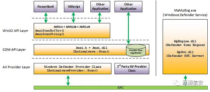 简单来说,AMSI是微软实现的,用于扫描内存中程序的执行情况。它也在 PowerShell 中实现,这意味着我们在 PowerShell 中运行的任何命令和脚本都会首先传递到 AMSI 进行检测,然后传递到主防病毒引擎。