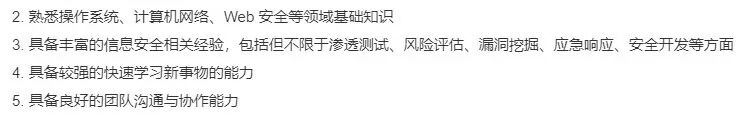 其次要求网安领域的专业技能,包括但不限于渗透测试、风险评估、漏洞挖掘、应急响应、安全开发等方面,当然,不同岗位的要求会有所不同。