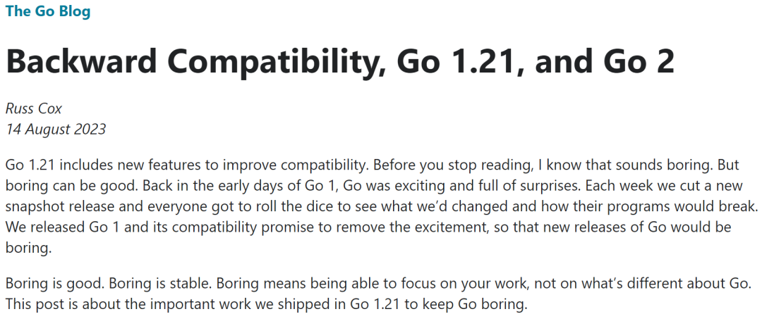 出品 | OSC开源社区(ID:oschina2013)上周发布的 Go 1.21 提到该版本继续保持了 Go 1 的兼容性承诺(甚至有所增强)。不过仍有人好奇,未来是否会发布一个会破坏与现有 Go