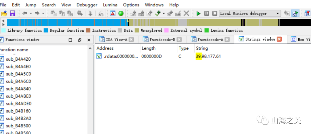 将程序扔到ida中,先搜索一下恶意ip地址,再到具体函数中进行分析: