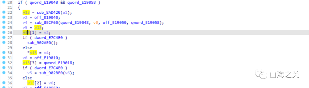 这里我们发现先将ip地址赋值给了v2,紧接着赋值给了字符数组v13[1],在这几行代码中,分别给v13[0]到v13[3]共四个位置赋值,而且v13一直到达了函数尾部,因此这个v13应该就是建立连接的参数数组: