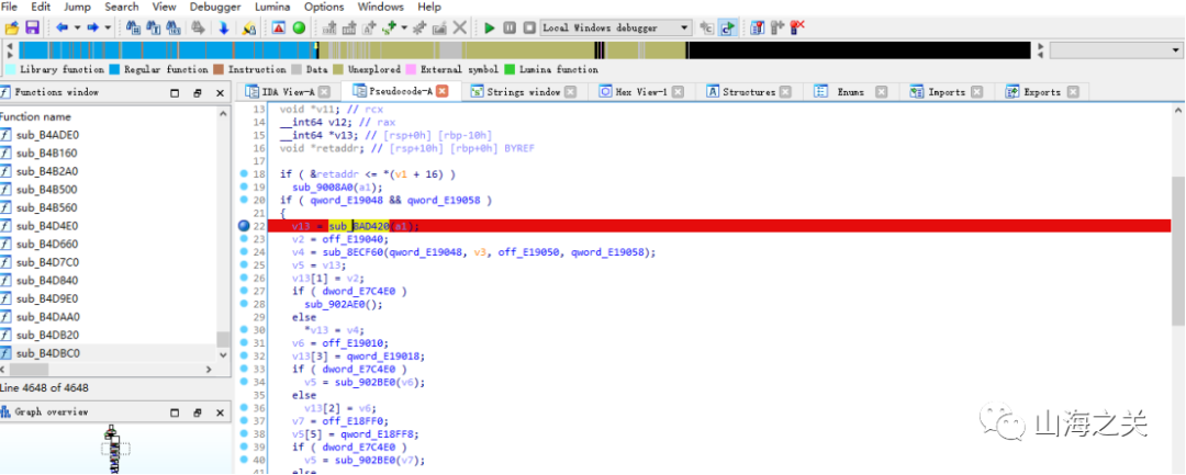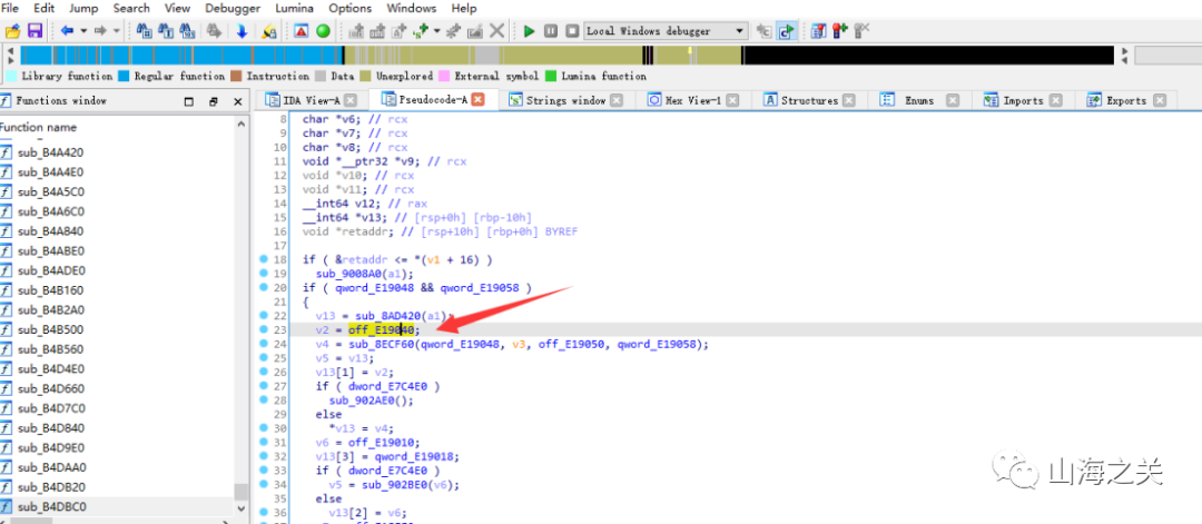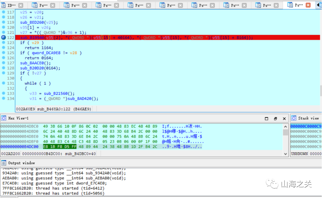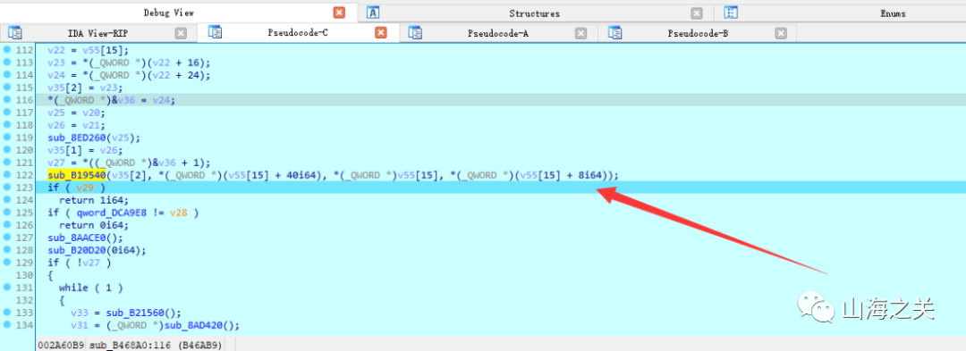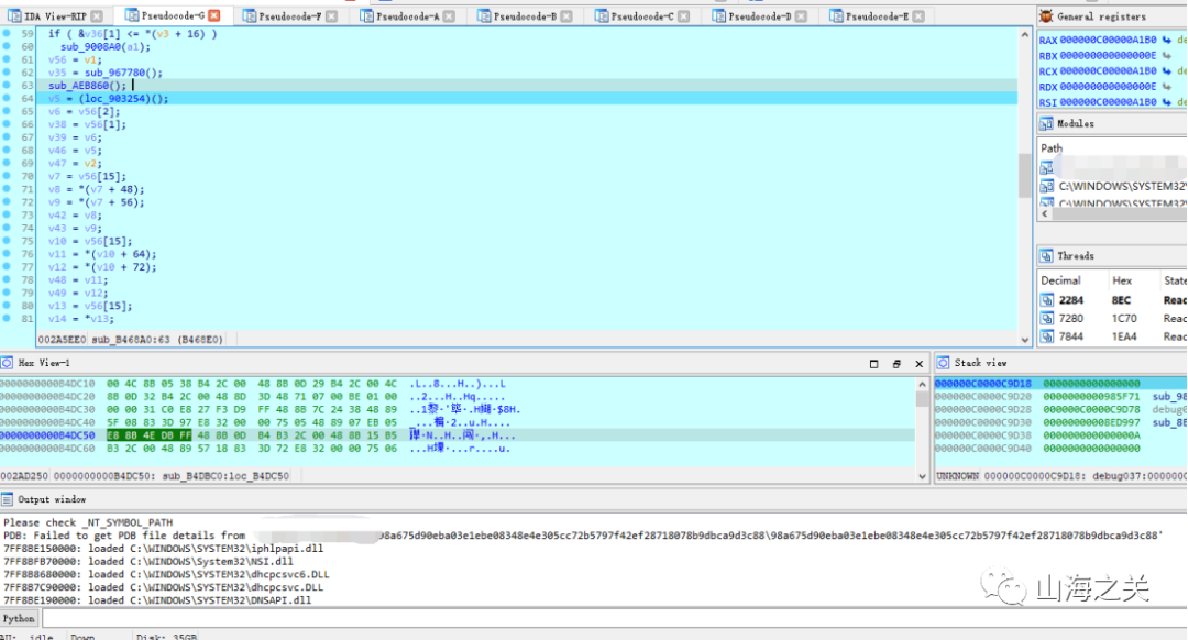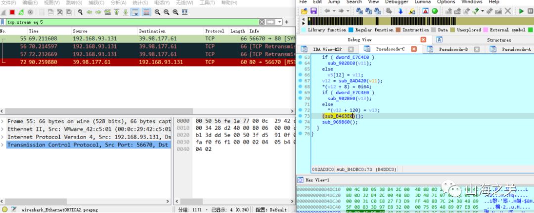 通过动调我们发现,是在倒数第二个函数sub_B463E0调用时,wireshark出现了与恶意ip的数据包,且程序调用了各种通信dll,所以接下来我们重点看看这个函数做了什么。