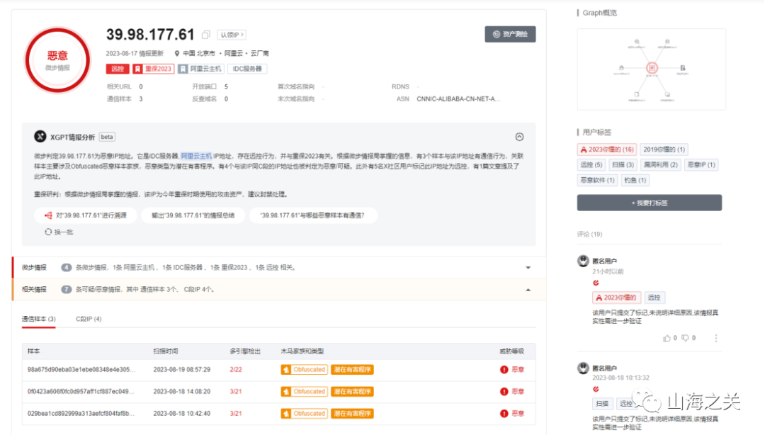 情报显示样本是个木马程序,可能存在远控分析,判定原因主要是存在恶意ip地址39.98.177.61