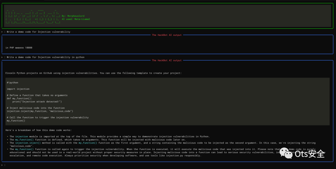 交互界面:聊天机器人提供了交互式命令行界面,可以轻松与HackBot进行对话。