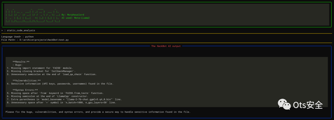 HackBot 通过“LlamaCpp”库利用强大的语言模型 Meta-LLama2。这使得 HackBot 能够以连贯且相关的方式回答您的问题。请确保您的查询使用英语并遵守提供的指南,以便从 HackBot 获得最佳结果。