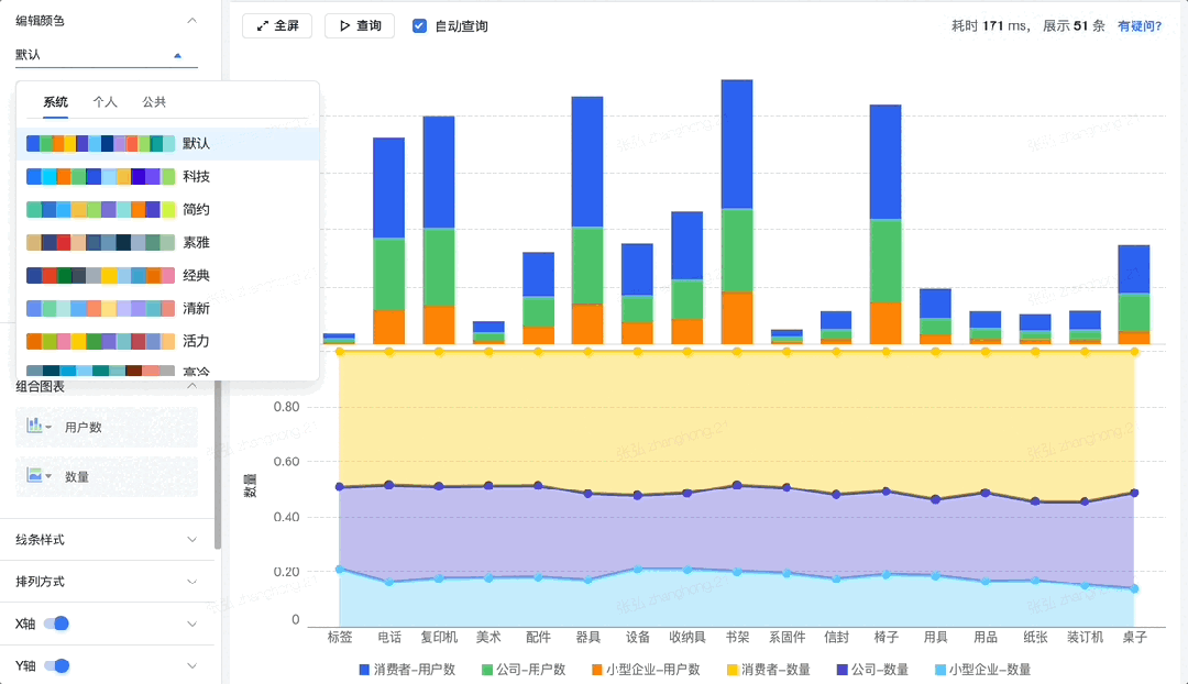 语义色板:支持将常用色值语义化并在图表中随处使用,以统一色彩风格。也就是为颜色赋予有意义的名称,从而方便维护和修改。