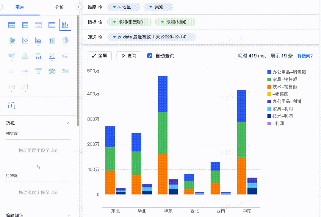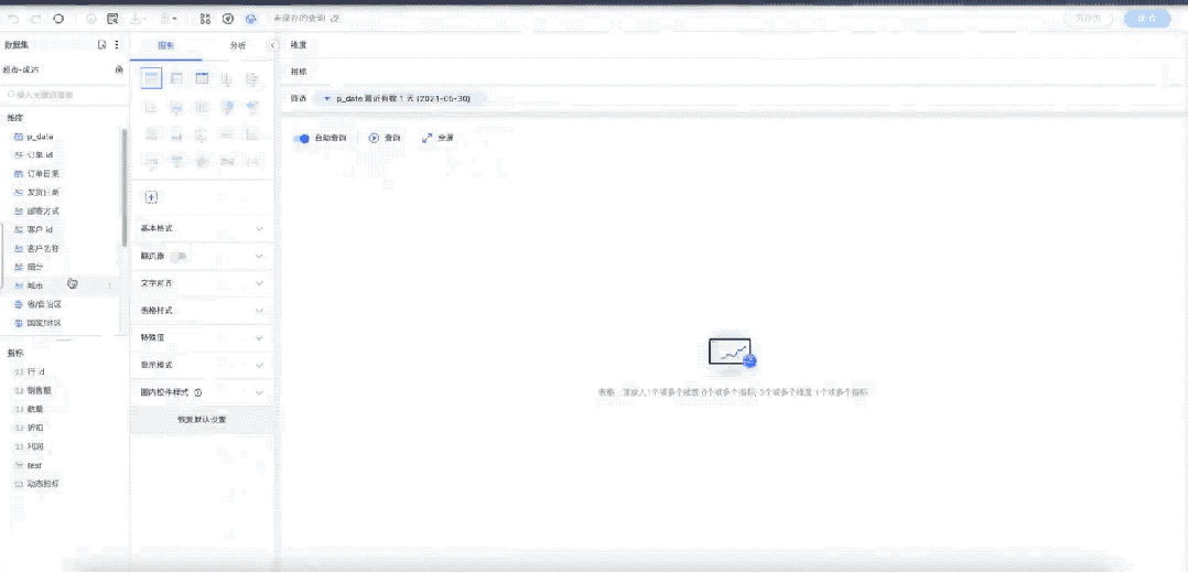 智能化是BI产品的发展趋势。当图表中的字段确定后,选择合适的图表类型对数据进行展示,对于快速获取数据中的洞察信息具有十分重要的意义。DataWind中的图表推荐包括图表类型的推荐和图表字段的推荐。前者能够根据当前选择的维度和指标字段,推荐最适合进行数据展示的图表类型;后者能够在用户切换图表类型时,自动将数据字段分配到合适的视觉通道上,极大地增强用户进行探索式分析的能力,轻松制作可视化报表。