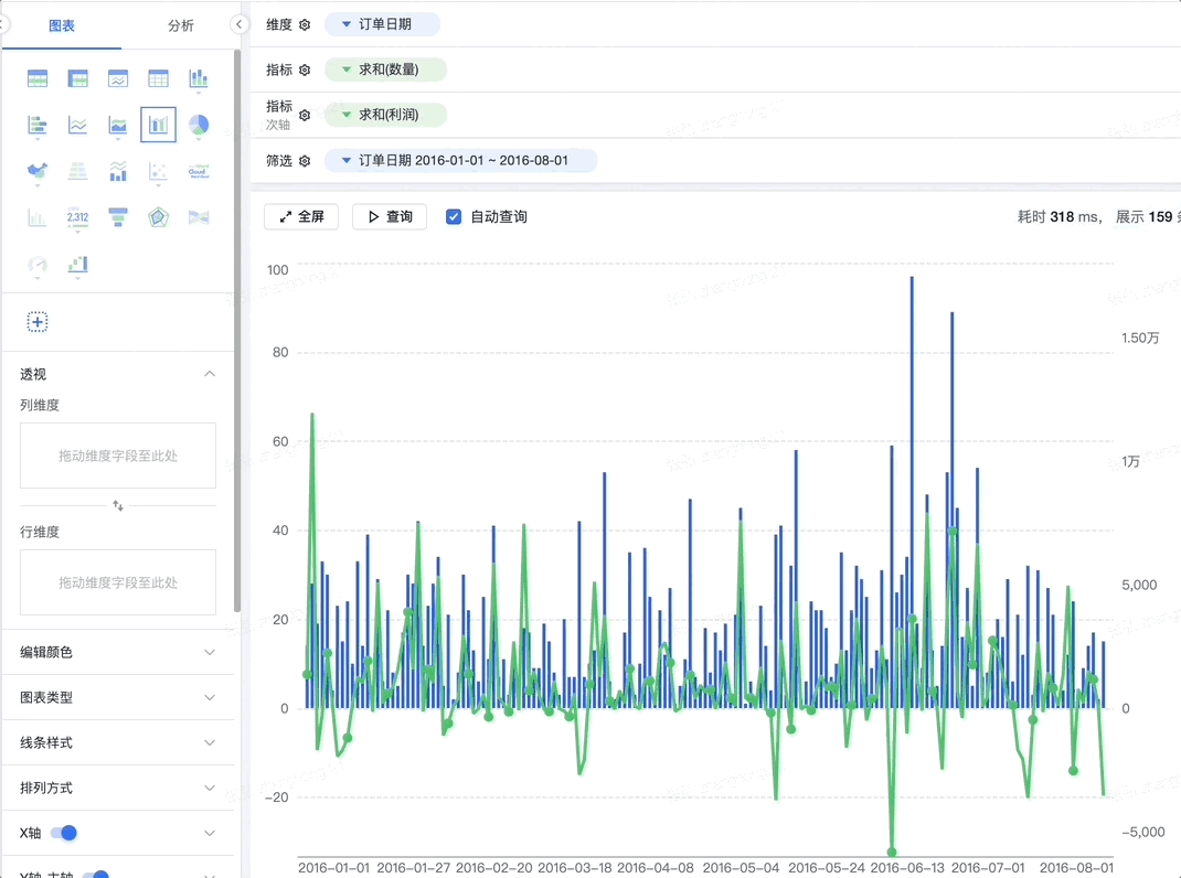 组合图表可以将多个笛卡尔坐标系下的图表并列展示,方便用户对相同维度下的不同指标进行对比观察,组合图不但提供基础图表的组合,还提供了与双轴图得组合。