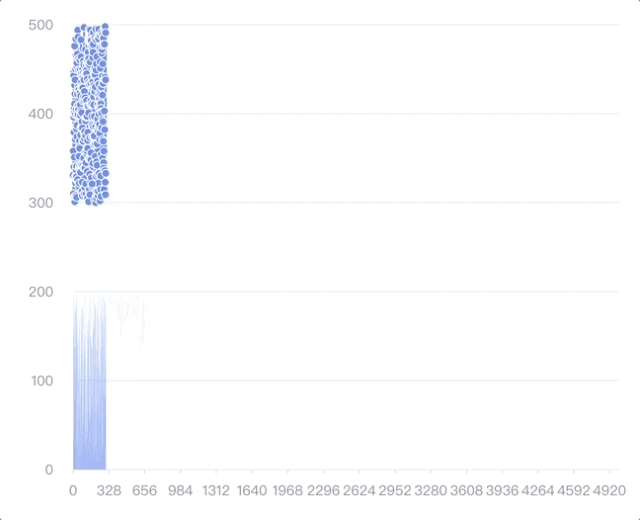除此之外,VChart 还支持渐进式渲染以避免大量图形的绘制导致的页面卡顿。通过渲染任务拆分,VChart 将创建好的图形元素放置在多个帧内执行渲染,从而避免过长的同步计算任务阻塞住页面逻辑,使得图表呈现流畅自如。VChart 支持在任意图表中开启渐进式渲染配置,以下图为例: